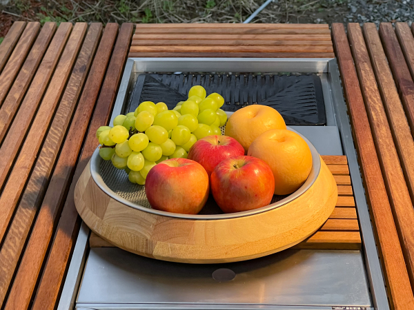 - お食事は夕朝食ともにテント前に設置したウッドテーブル(組み込み式のガスグリル)にてお楽しみください。